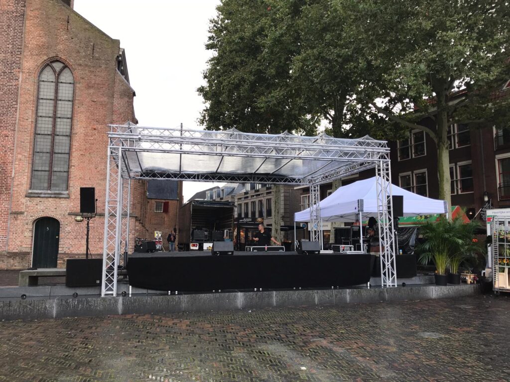 Onze podia worden netjes afgewerkt met tapijttegels en afrok, zodat ze er strak en professioneel uitzien en perfect aansluiten bij de uitstraling van het evenement. Uiteraard verzorgen wij ook de op- en afbouw, zodat jij nergens omkijken naar hebt.