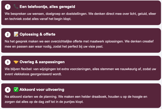 De aanpak is eenvoudig: neem contact met ons op en bespreek de wensen en eisen. Vanaf dat moment regelen wij alles. Met veel materialen in eigen beheer en een sterk netwerk daarbuiten heb je één vast aanspreekpunt: Clipperms. Zo kun jij je volledig richten op de inhoud van het evenement — wij regelen de rest.